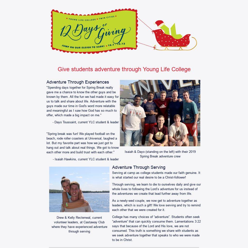 College has many choices of “adventure”. Students often seek “adventure” that can quickly consume them. Lamentations 3:22 says that because of the Lord and His love, we are not consumed. This truth is something we share with students as we seek adventure together that speaks to who we were made to be in Christ.