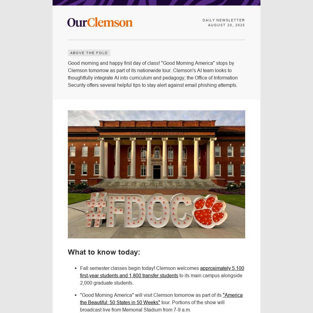 Good morning and happy first day of class! "Good Morning America" stops by Clemson tomorrow as part of its nationwide tour. Clemson's AI team looks to thoughtfully integrate AI into curriculum and pedagogy; the Office of Information Security offers several helpful tips to stay alert against email phishing attempts.
