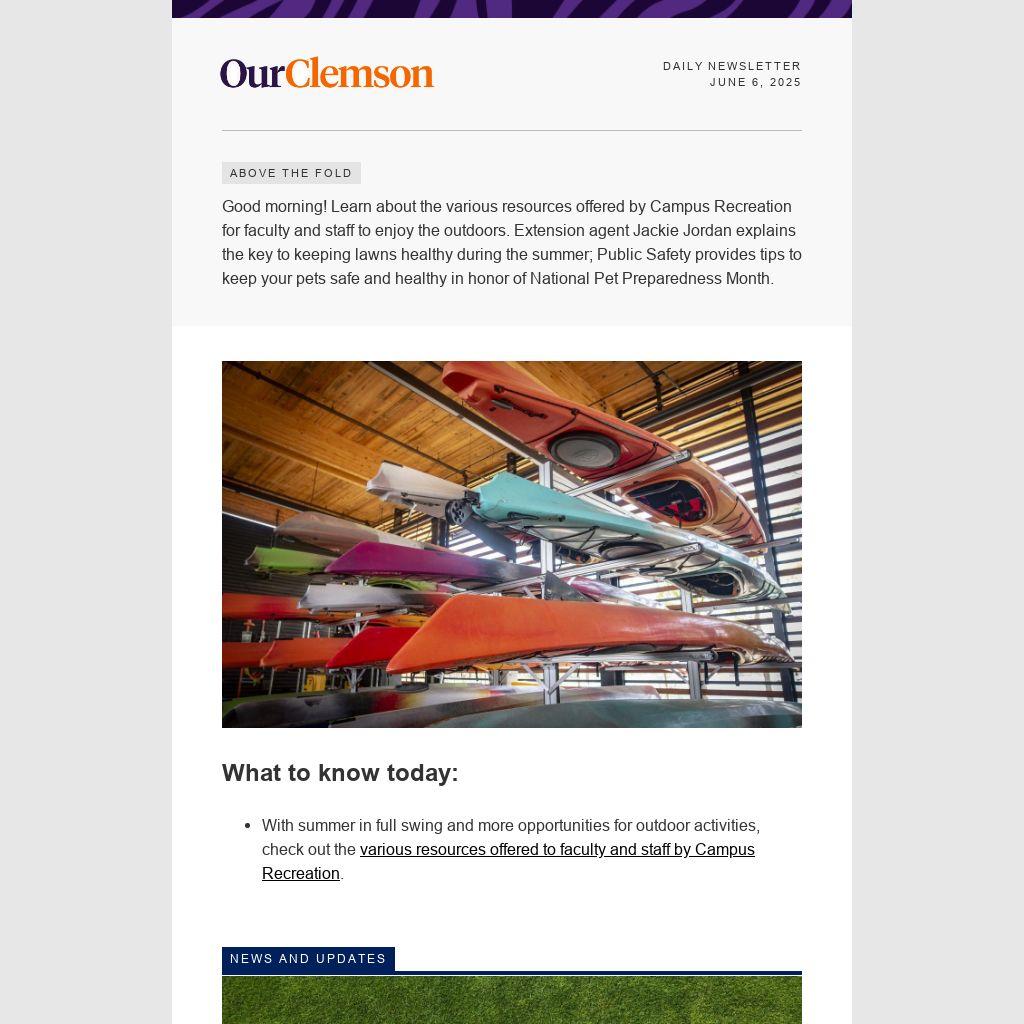 Good morning! Learn about the various resources offered by Campus Recreation for faculty and staff to enjoy the outdoors. Extension agent Jackie Jordan explains the key to keeping lawns healthy during the summer; Public Safety provides tips to keep your pets safe and healthy in honor of National Pet Preparedness Month.