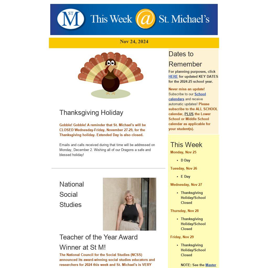Gobble! Gobble! A reminder that St. Michael's will be CLOSED Wednesday-Friday, November 27-29, for the Thanksgiving holiday. Extended Day is also closed.