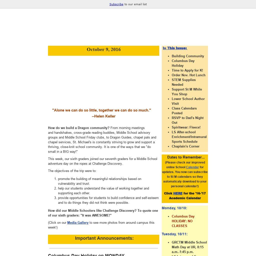 | Dates to Remember...(Please check our improved online School Calendar for updates. You now can subscribe to St M calendars so they automaticaly download to your personal calendar!) Click HERE for the '16-'17 Academic Calendar