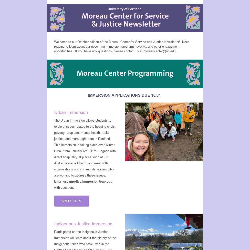 Welcome to our October edition of the Moreau Center for Service and Justice Newsletter! Keep reading to learn about our upcoming immersion programs, events, and other engagement opportunities. If you have any questions, please contact us at moreaucenter@up.edu.