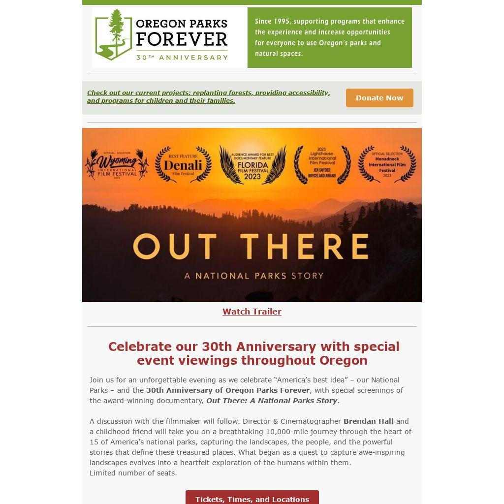 Join us for an unforgettable evening as we celebrate “America’s best idea” – our National Parks – and the 30th Anniversary of Oregon Parks Forever, with special screenings of the award-winning documentary, Out There: A National Parks Story.