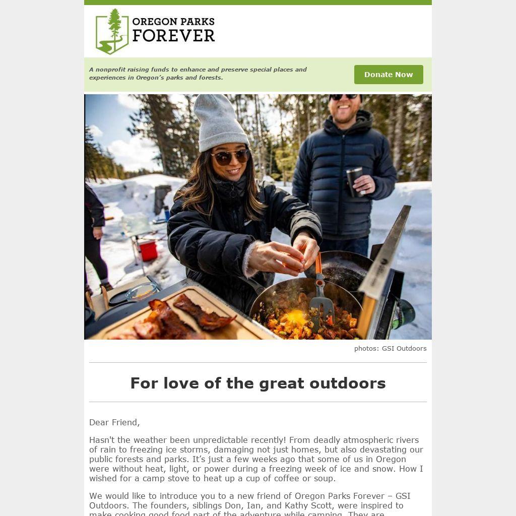 We would like to introduce you to a new friend of Oregon Parks Forever – GSI Outdoors. The founders, siblings Don, Ian, and Kathy Scott, were inspired to make cooking good food part of the adventure while camping. They are supporting our February Show Some Love New Members Drive by offering a generous 10% discount to people signing up this month. So don't delay!