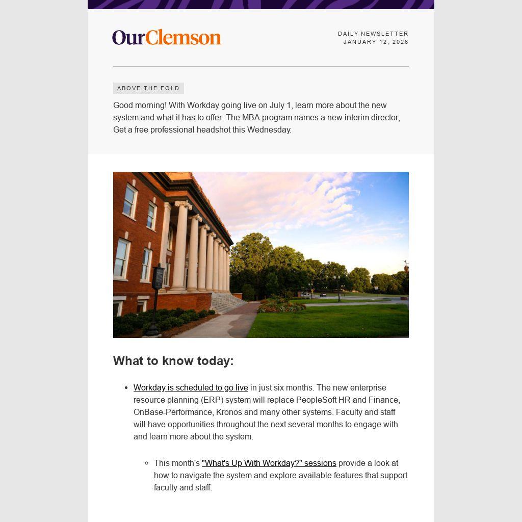 Good morning! With Workday going live on July 1, learn more about the new system and what it has to offer. The MBA program names a new interim director; Get a free professional headshot this Wednesday.