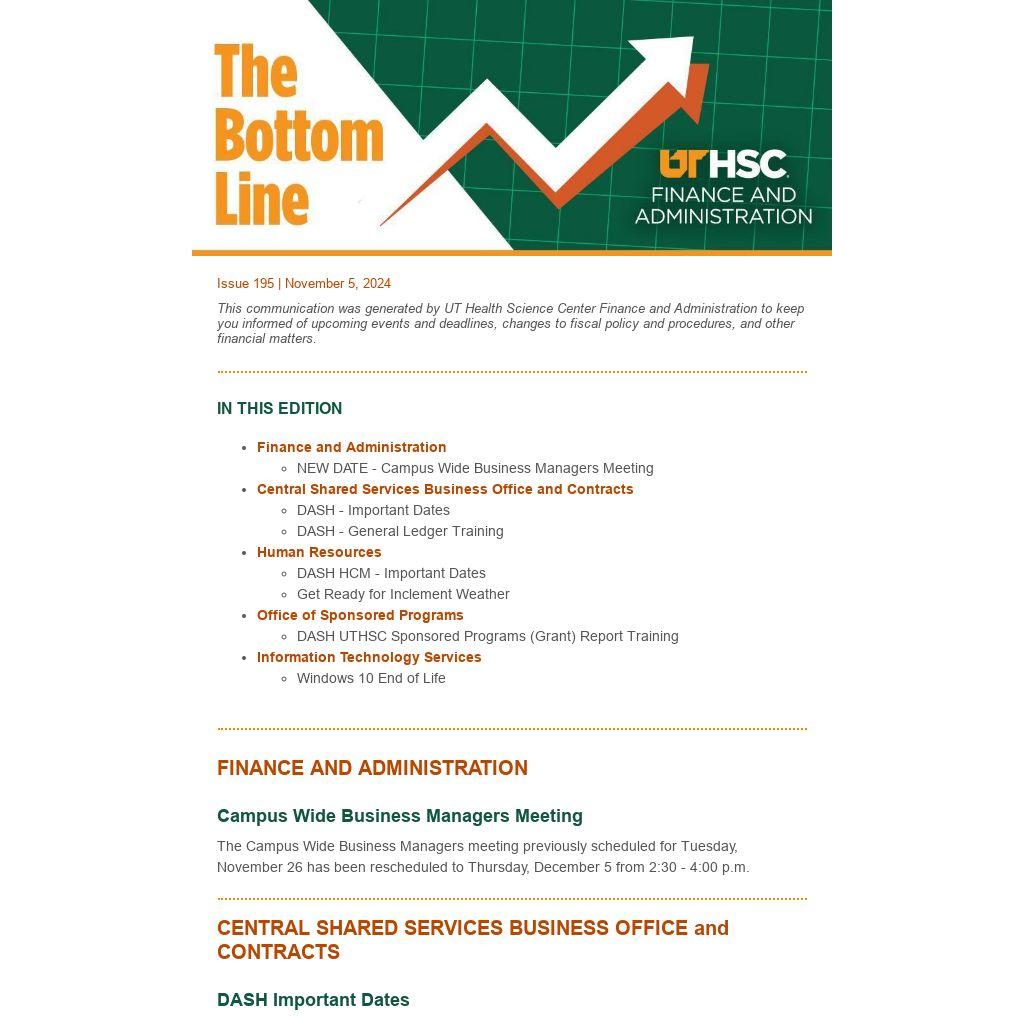 This communication was generated by UT Health Science Center Finance and Administration to keep you informed of upcoming events and deadlines, changes to fiscal policy and procedures, and other financial matters.
