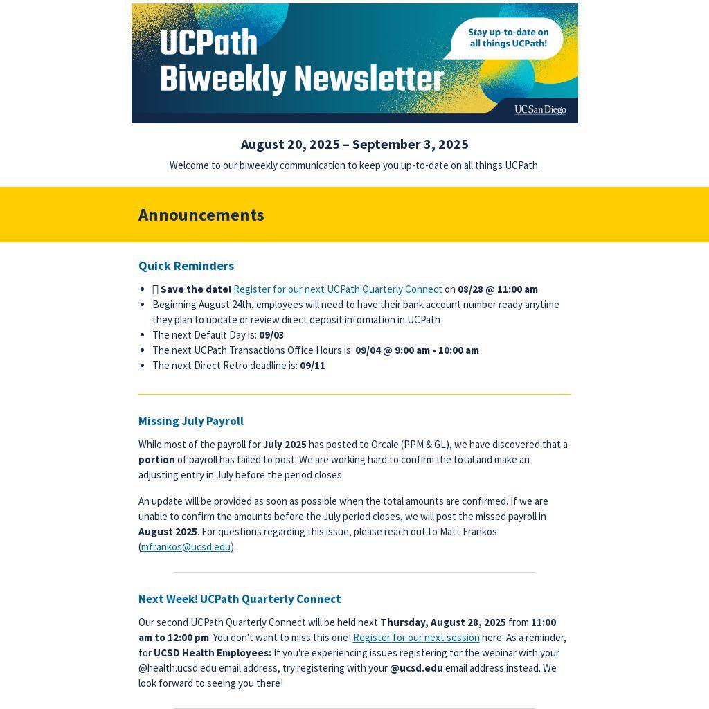 Our second UCPath Quarterly Connect will be held next Thursday, August 28, 2025 from 11:00 am to 12:00 pm. You don't want to miss this one! Register for our next session here. As a reminder, for UCSD Health Employees: If you're experiencing issues registering for the webinar with your @health.ucsd.edu email address, try registering with your @ucsd.edu email address instead. We look forward to seeing you there!