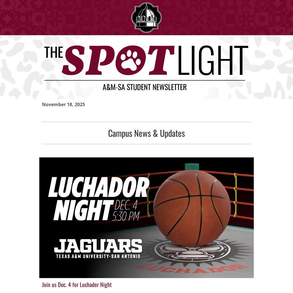 The Spotlight is the campus newsletter for the students of Texas A&M-San Antonio. The Spotlight is published every Tuesday from the start of the semester, providing insight into A&M-SA news, events, and announcements. If you would like to promote a University-wide event or announcement in The Spotlight, submit this form by 5 p.m. CT on a Monday the week before publication.