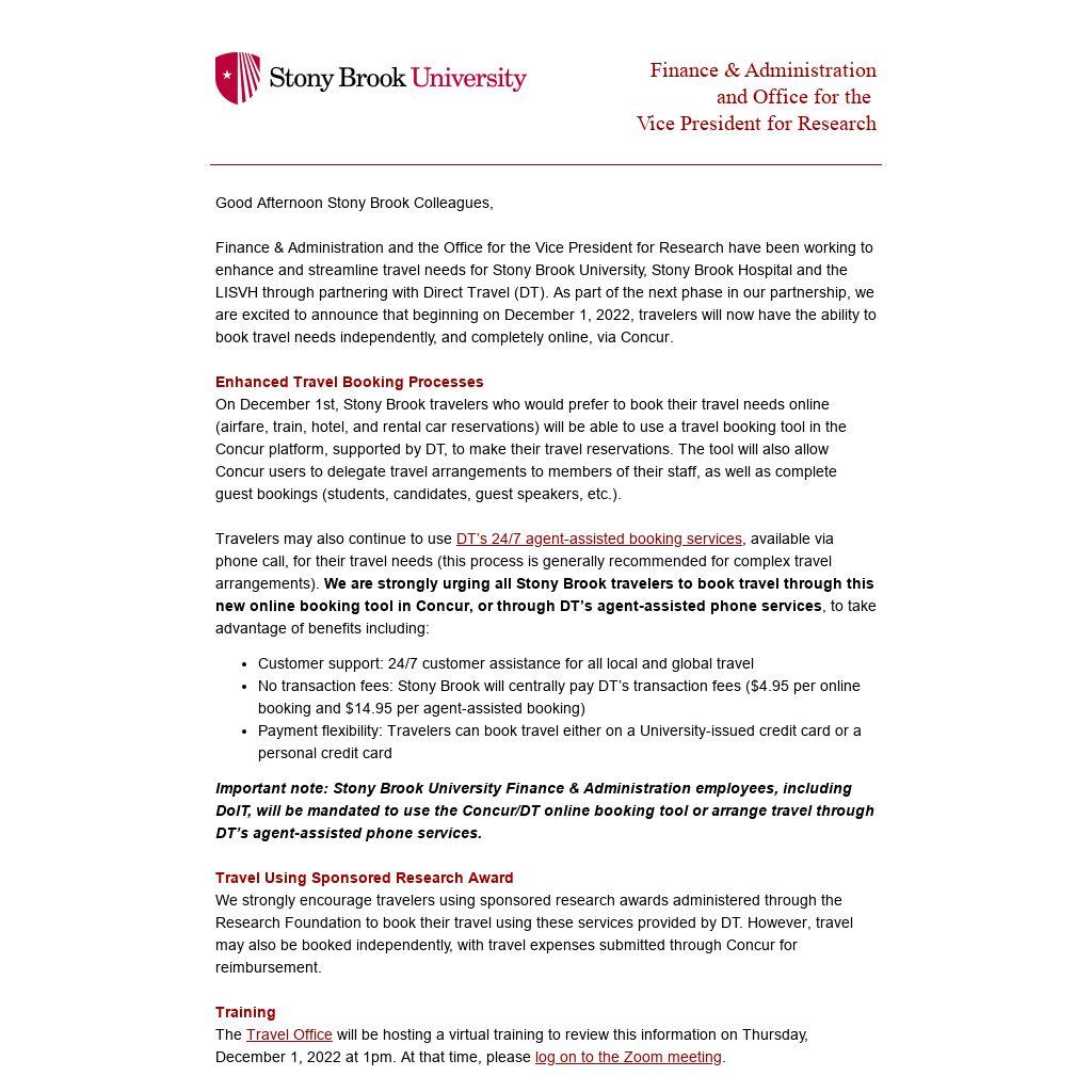 Important note: Stony Brook University Finance & Administration employees, including DoIT, will be mandated to use the Concur/DT online booking tool or arrange travel through DT’s agent-assisted phone services.