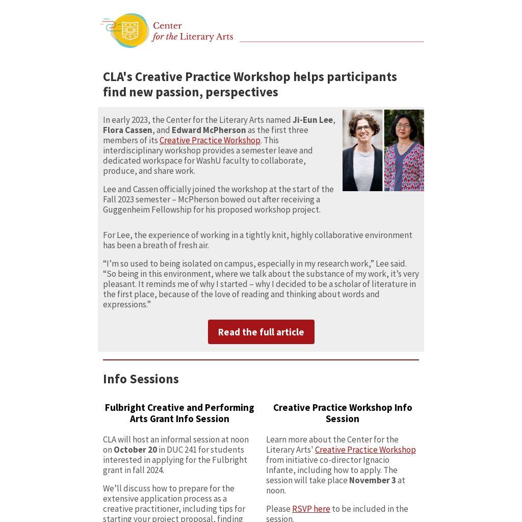 Learn more about the Center for the Literary Arts' Creative Practice Workshop from initiative co-director Ignacio Infante, including how to apply. The session will take place November 3 at noon.