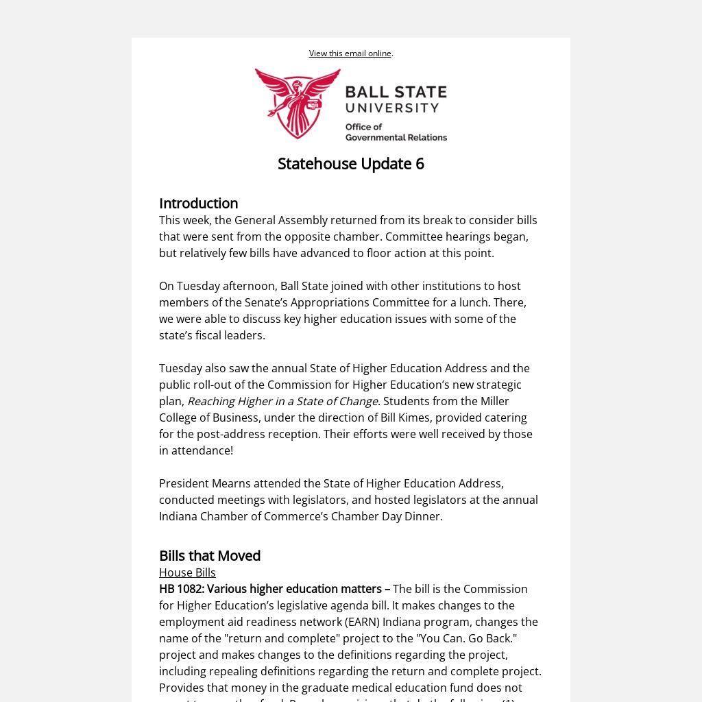 HB 1082: Various higher education matters – The bill is the Commission for Higher Education’s legislative agenda bill. It makes changes to the employment aid readiness network (EARN) Indiana program, changes the name of the "return and complete" project to the "You Can. Go Back." project and makes changes to the definitions regarding the project, including repealing definitions regarding the return and complete project. Provides that money in the graduate medical education fund does not revert to any other fund. Repeals provisions that do the following: (1) Require state educational institutions to report annually to the commission regarding return and complete students. (2) Expire the return and complete project provisions. The bill was amended in committee to strike the “You Can. Go Back” project name and to reiterate the need for ICHE to work with institutions on outreach to students. Ball State provide testimony on behalf of all of the public institutions in support of the bill, which was heard in the Senate Education and Career Development Committee and is eligible for amendments and a committee vote next week.