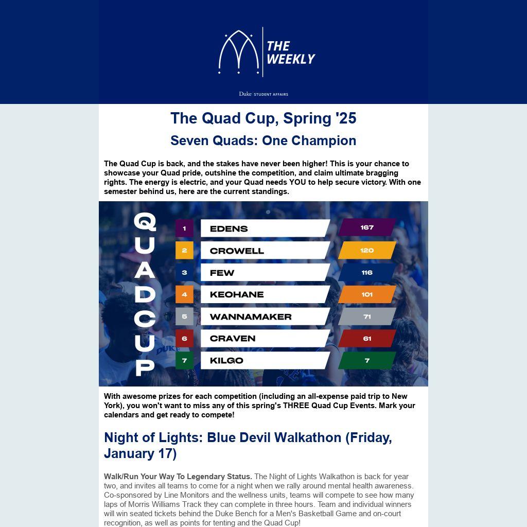 The Quad Cup is back, and the stakes have never been higher! This is your chance to showcase your Quad pride, outshine the competition, and claim ultimate bragging rights. The energy is electric, and your Quad needs YOU to help secure victory. With one semester behind us, here are the current standings.