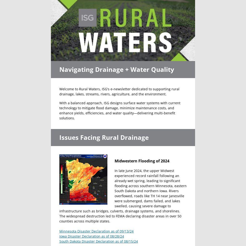 Welcome to Rural Waters, ISG's e-newsletter dedicated to supporting rural drainage, lakes, streams, rivers, agriculture, and the environment.