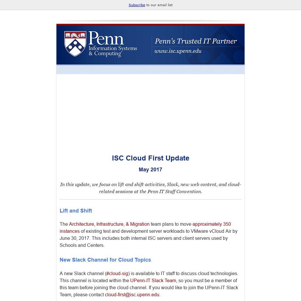 In this update, we focus on lift and shift activities, Slack, new web content, and cloud-related sessions at the Penn IT Staff Convention.