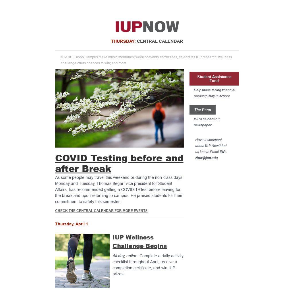 Distributed to IUP employees and students four days a week, IUP Now is the official newsletter of Indiana University of Pennsylvania. It features news from across the IUP website, compiled by the Division of Marketing and Communications. Find out how to get your news and events in IUP Now.
