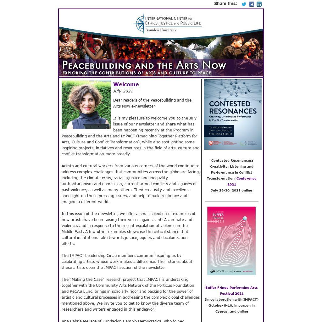 It is my pleasure to welcome you to the July issue of our newsletter and share what has been happening recently at the Program in Peacebuilding and the Arts and IMPACT (Imagining Together Platform for Arts, Culture and Conflict Transformation), while also spotlighting some inspiring projects, initiatives and resources in the field of arts, culture and conflict transformation more broadly.