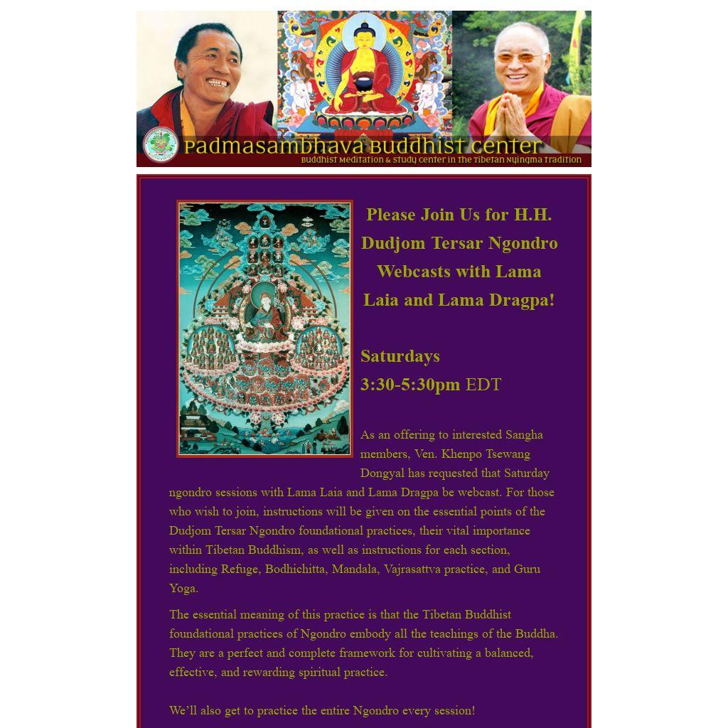 As an offering to interested Sangha members, Ven. Khenpo Tsewang Dongyal has requested that Saturday ngondro sessions with Lama Laia and Lama Dragpa be webcast. For those who wish to join, instructions will be given on the essential points of the Dudjom Tersar Ngondro foundational practices, their vital importance within Tibetan Buddhism, as well as instructions for each section, including Refuge, Bodhichitta, Mandala, Vajrasattva practice, and Guru Yoga.