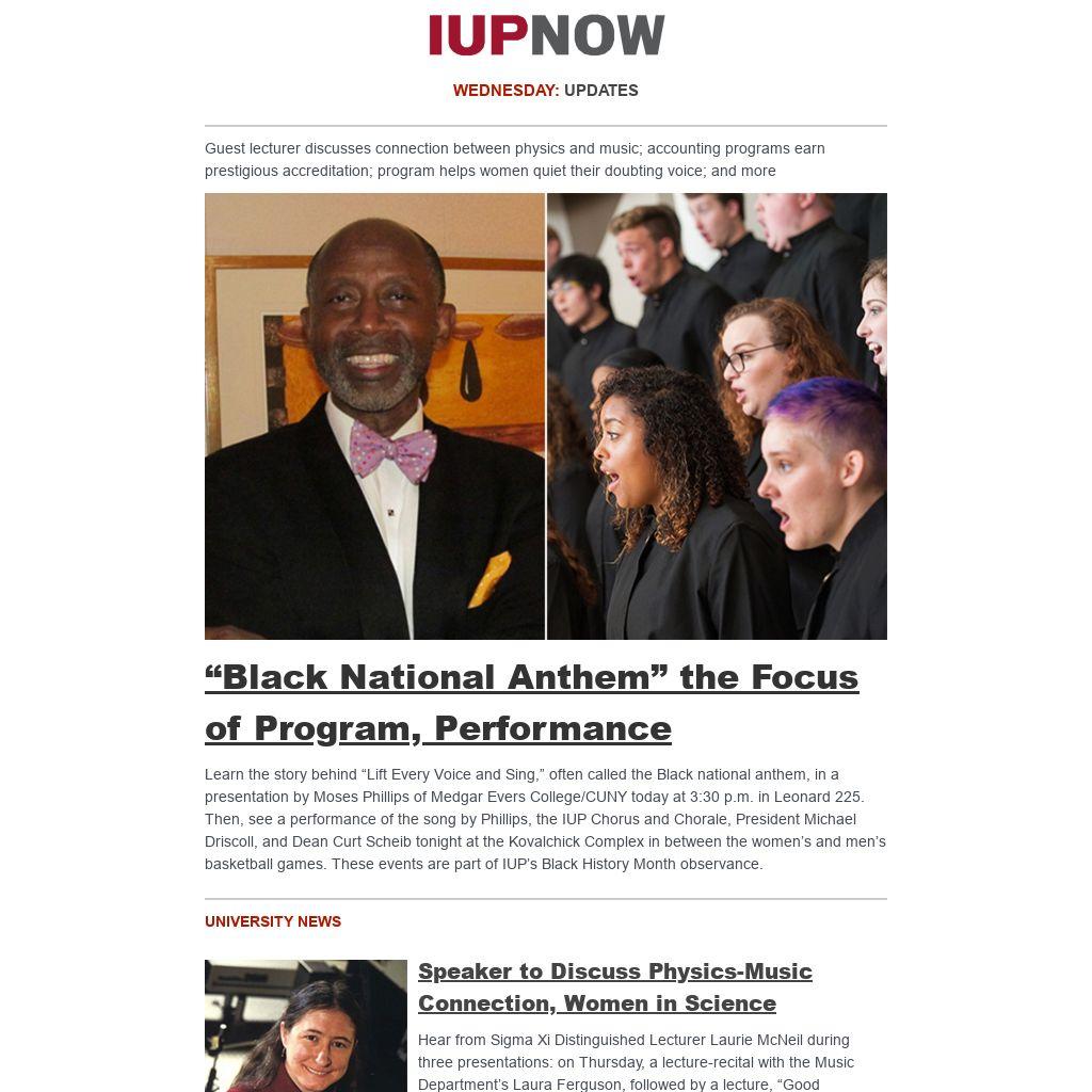 Learn the story behind “Lift Every Voice and Sing,” often called the Black national anthem, in a presentation by Moses Phillips of Medgar Evers College/CUNY today at 3:30 p.m. in Leonard 225. Then, see a performance of the song by Phillips, the IUP Chorus and Chorale, President Michael Driscoll, and Dean Curt Scheib tonight at the Kovalchick Complex in between the women’s and men’s basketball games. These events are part of IUP’s Black History Month observance.