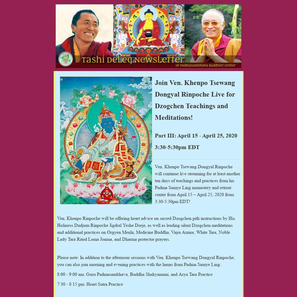 Ven. Khenpo Tsewang Dongyal Rinpoche will continue live streaming for at least another ten days of teachings and practices from his Padma Samye Ling monastery and retreat center from April 15 – April 25, 2020 from 3:30-5:30pm EDT!