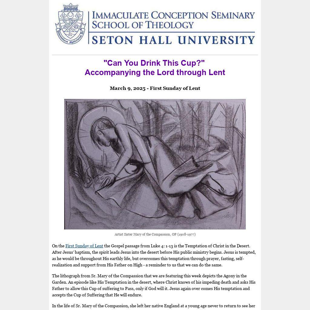 The lithograph from Sr. Mary of the Compassion that we are featuring this week depicts the Agony in the Garden. An episode like His Temptation in the desert, where Christ knows of his impeding death and asks His Father to allow this Cup of suffering to Pass, only if God will it. Jesus again over comes His temptation and accepts the Cup of Suffering that He will endure.