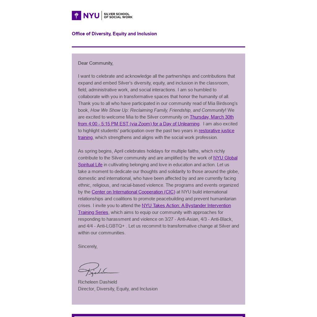 As spring begins, April celebrates holidays for multiple faiths, which richly contribute to the Silver community and are amplified by the work of NYU Global Spiritual Life in cultivating belonging and love in education and action. Let us take a moment to dedicate our thoughts and solidarity to those around the globe, domestic and international, who have been affected by and are currently facing ethnic, religious, and racial-based violence. The programs and events organized by the Center on International Cooperation (CIC) at NYU build international relationships and coalitions to promote peacebuilding and prevent humanitarian crises. I invite you to attend the NYU Takes Action: A Bystander Intervention Training Series, which aims to equip our community with approaches for responding to harassment and violence on 3/27 - Anti-Asian, 4/3 - Anti-Black, and 4/4 - Anti-LGBTQ+ . Let us recommit to transformative change at Silver and within our communities.