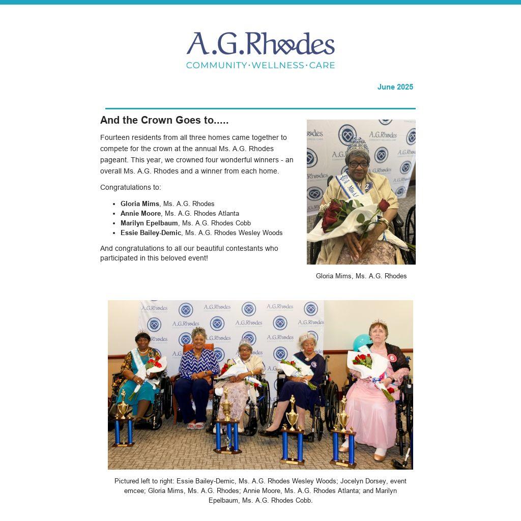 Fourteen residents from all three homes came together to compete for the crown at the annual Ms. A.G. Rhodes pageant. This year, we crowned four wonderful winners - an overall Ms. A.G. Rhodes and a winner from each home.