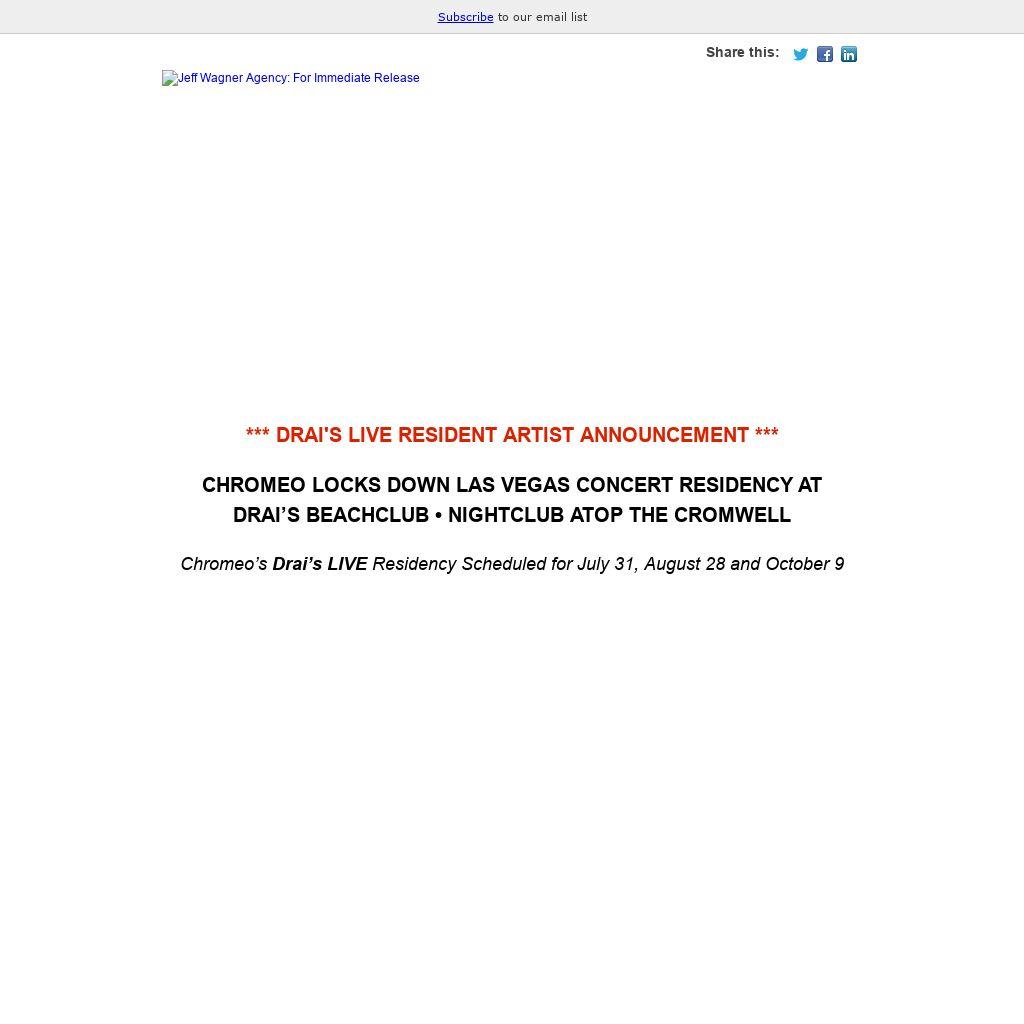 In addition to Chromeo’s Drai’s LIVE performances, fans can also catch the pair as they take over the turntables throughout pool season with exclusive DJ sets at Drai’s Beachclub. Their next live DJ set at Beachclub is scheduled for Friday, May 22.