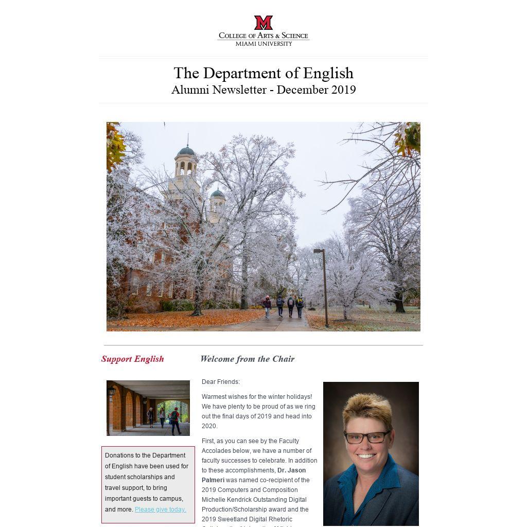 First, as you can see by the Faculty Accolades below, we have a number of faculty successes to celebrate. In addition to these accomplishments, Dr. Jason Palmeri was named co-recipient of the 2019 Computers and Composition Michelle Kendrick Outstanding Digital Production/Scholarship award and the 2019 Sweetland Digital Rhetoric Collaborative/University of Michigan Book Prize. Dr. Palmeri is the second Miami recipient of the award in the last two years, as Dr. Tim Lockridge was the co-recipient of both prizes last year. We look forward to the publication of Dr. Lockridge’s Writing Workflows (with Derek Van Ittersum) from University of Michigan Press in 2020. Also for your 2020 book list consider Dr. TaraShea Nesbit’s forthcoming novel Beheld, which is scheduled to come out from Bloomsbury on the 400th anniversary of the voyage of the Mayflower. Later in the year, look forward to Dr. Mary Jean Corbett’s book, Behind the Times: Virginia Woolf in Late-Victorian Contexts forthcoming from Cornell University Press.