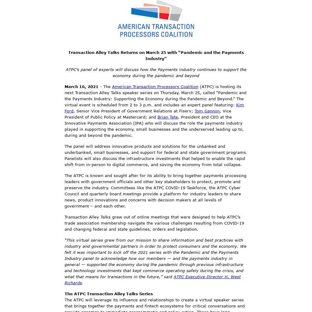 ATPC’s panel of experts will discuss how the Payments industry continues to support the economy during the pandemic and beyond March 16, 2021 - The American Transaction Processors Coalition (ATPC) is hosting its next Transaction Alley Talks speaker series on Thursday, March 25, called “Pandemic and the Payments Industry: Supporting the Economy during the Pandemic and Beyond.” The virtual event is scheduled from 2 to 3 p.m. and includes an expert panel featuring: Kim Ford, Senior Vice President of Government Relations at Fiserv; Tom Gannon, Vice President of Public Policy at Mastercard; and Brian Tate, President and CEO at the Innovative Payments Association (IPA) who will discuss the role the payments industry played in supporting the economy, small businesses and the underserved leading up to, during and beyond the pandemic. The panel will address innovative products and solutions for the unbanked and underbanked, small businesses, and support for federal and state government programs. Panelists will also discuss the infrastructure investments that helped to enable the rapid shift from in-person to digital commerce, and saving the economy from total collapse. The ATPC is known and sought after for its ability to bring together payments processing leaders with government officials and other key stakeholders to protect, promote and preserve the industry. Committees like the ATPC COVID-19 Taskforce, the ATPC Cyber Council and quarterly board meetings provide a platform for industry leaders to share news, product innovations and concerns with decision makers at all levels of government – and each other. Transaction Alley Talks grew out of online meetings that were designed to help ATPC’s trade association membership navigate the various challenges resulting from COVID-19 and changing federal and state guidelines, orders and legislation. “This virtual series grew from our mission to share information and best practices with industry and governmental partners in order to protect consumers and the economy. We felt it was important to kick off the 2021 series with the Pandemic and the Payments Industry panel to acknowledge how our members — and the payments industry in general — supported the economy during the pandemic through previous infrastructure and technology investments that kept commerce operating safely during the crisis, and what that means for transactions in the future,” said ATPC Executive Director H. West Richards. The ATPC Transaction Alley Talks Series About the American Transaction Processors Coalition MEDIA CONTACT: Patrick Greer |