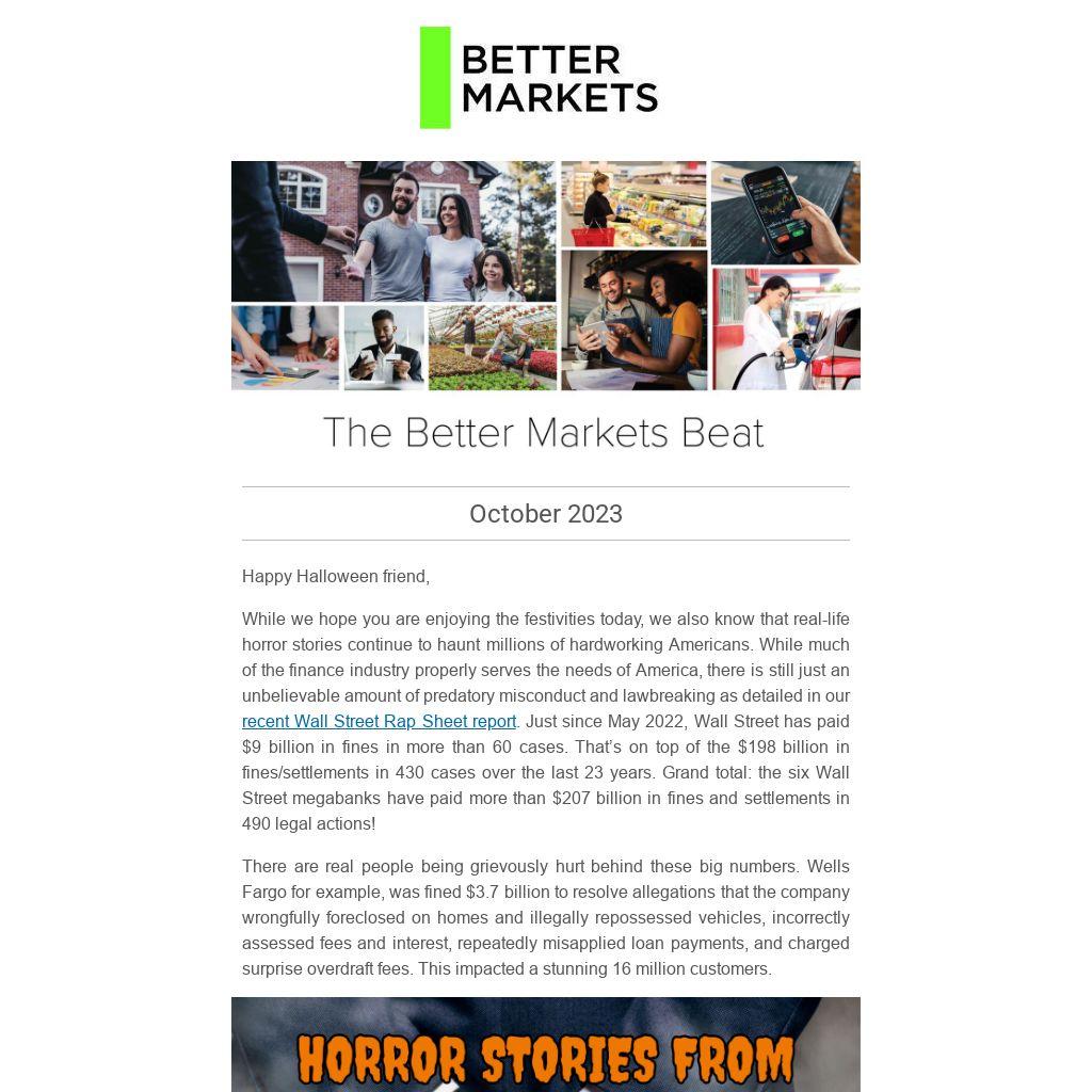 While we hope you are enjoying the festivities today, we also know that real-life horror stories continue to haunt millions of hardworking Americans. While much of the finance industry properly serves the needs of America, there is still just an unbelievable amount of predatory misconduct and lawbreaking as detailed in our recent Wall Street Rap Sheet report. Just since May 2022, Wall Street has paid $9 billion in fines in more than 60 cases. That’s on top of the $198 billion in fines/settlements in 430 cases over the last 23 years. Grand total: the six Wall Street megabanks have paid more than $207 billion in fines and settlements in 490 legal actions!