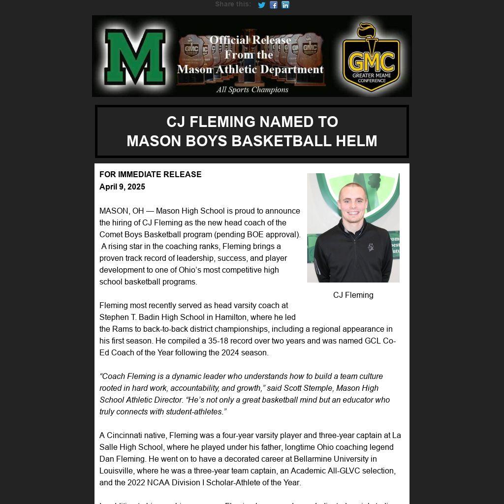 “Coach Fleming is a dynamic leader who understands how to build a team culture rooted in hard work, accountability, and growth,” said Scott Stemple, Mason High School Athletic Director. “He’s not only a great basketball mind but an educator who truly connects with student-athletes.”