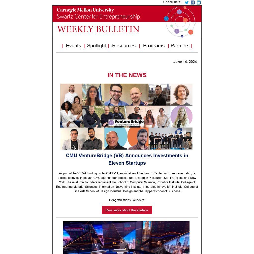 Have startup news or opportunities to share? Have questions about the Swartz Center Weekly Bulletin? Send news, opportunities or questions to Sonya Ford, Program Manager.