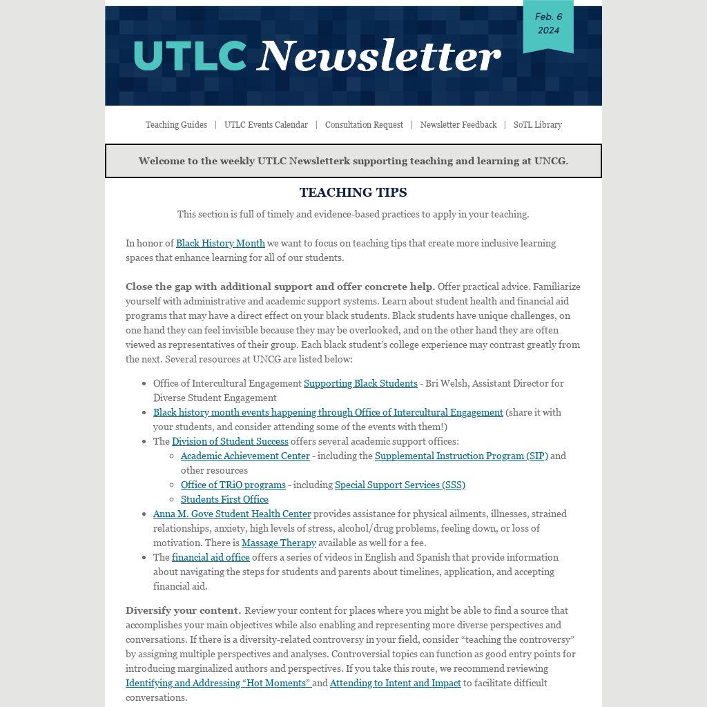 Welcome to the weekly UTLC Newsletterk supporting teaching and learning at UNCG.