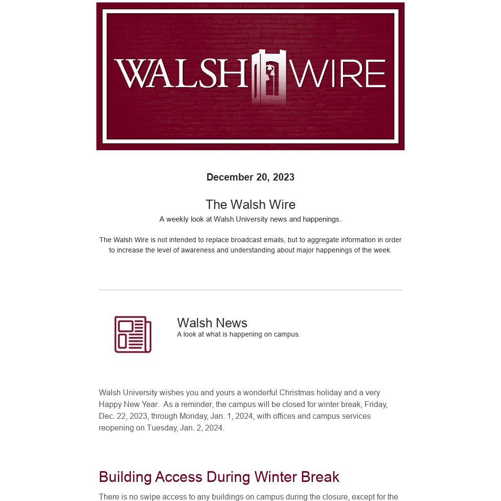 Walsh University wishes you and yours a wonderful Christmas holiday and a very Happy New Year. As a reminder, the campus will be closed for winter break, Friday, Dec. 22, 2023, through Monday, Jan. 1, 2024, with offices and campus services reopening on Tuesday, Jan. 2, 2024.