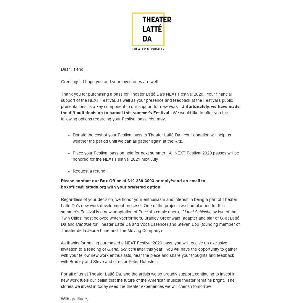 Thank you for purchasing a pass for Theater Latté Da's NEXT Festival 2020. Your financial support of the NEXT Festival, as well as your presence and feedback at the Festival's public presentations, is a key component to our support for new work. Unfortunately, we have made the difficult decision to cancel this summer's Festival. We would like to offer you the following options regarding your Festival pass. You may: