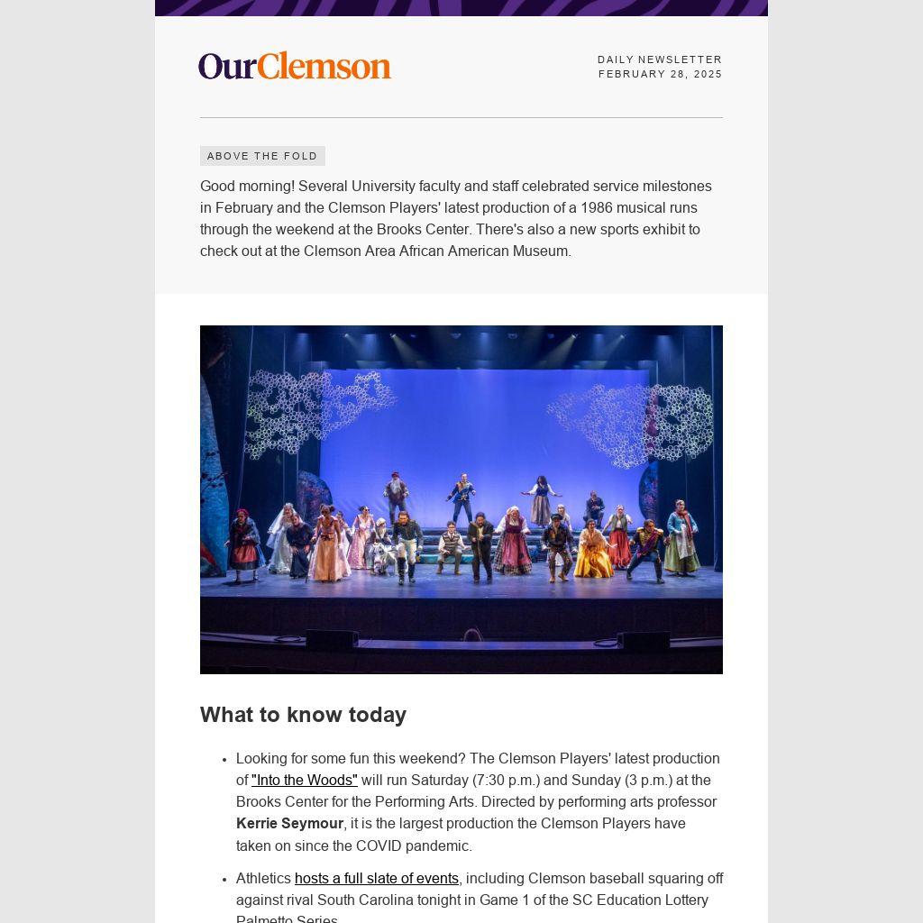 Good morning! Several University faculty and staff celebrated service milestones in February and the Clemson Players' latest production of a 1986 musical runs through the weekend at the Brooks Center. There's also a new sports exhibit to check out at the Clemson Area African American Museum.