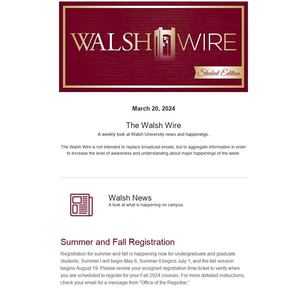 The Walsh Wire is not intended to replace broadcast emails, but to aggregate information in order to increase the level of awareness and understanding about major happenings of the week.