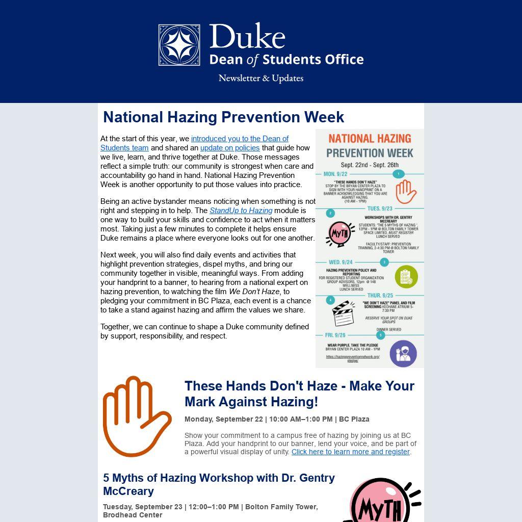 At the start of this year, we introduced you to the Dean of Students team and shared an update on policies that guide how we live, learn, and thrive together at Duke. Those messages reflect a simple truth: our community is strongest when care and accountability go hand in hand. National Hazing Prevention Week is another opportunity to put those values into practice.