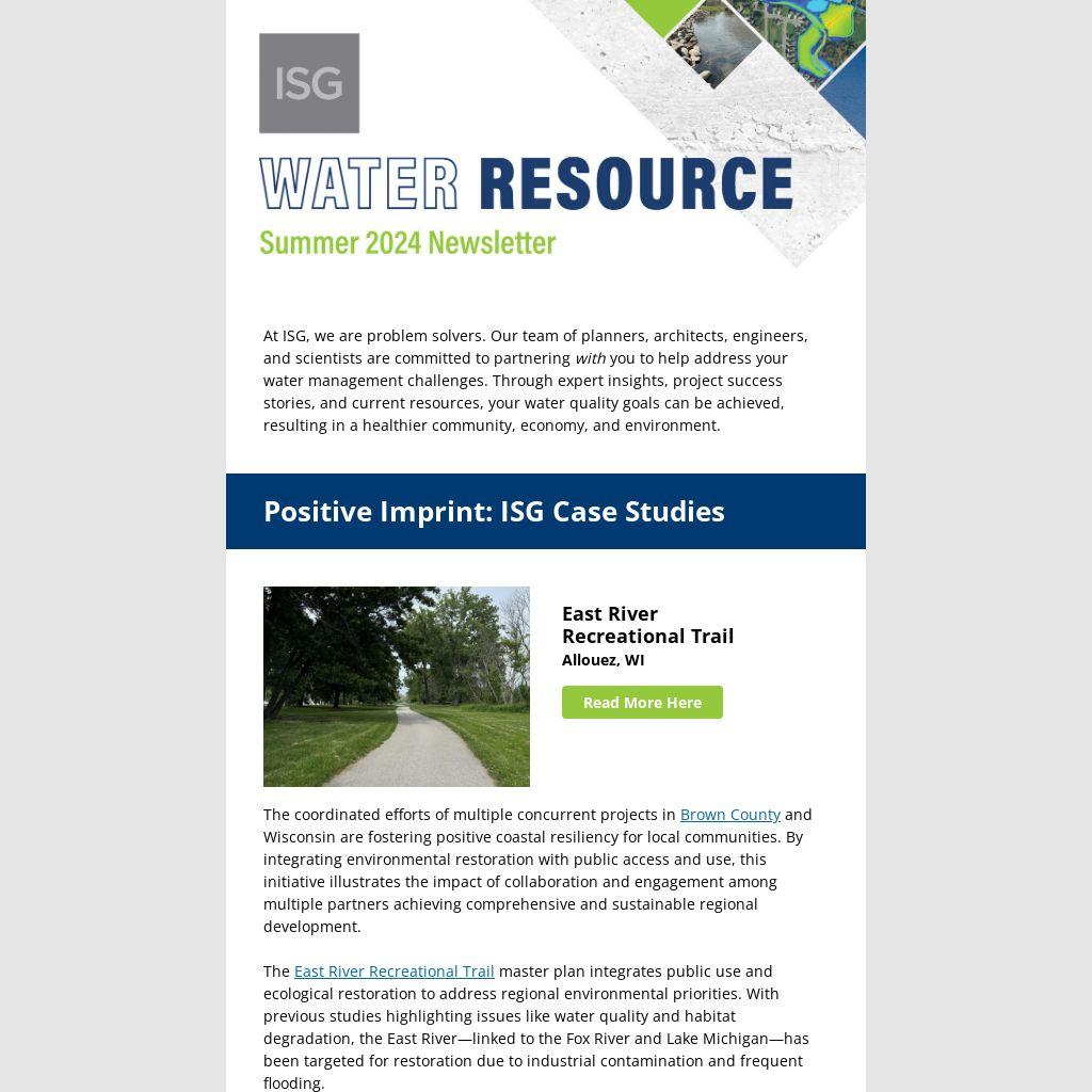 At ISG, we are problem solvers. Our team of planners, architects, engineers, and scientists are committed to partnering with you to help address your water management challenges. Through expert insights, project success stories, and current resources, your water quality goals can be achieved, resulting in a healthier community, economy, and environment.