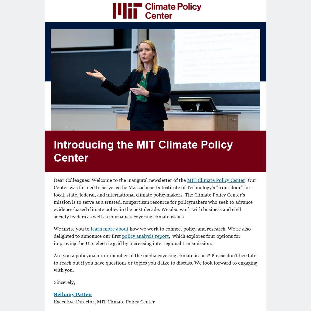 Dear Colleagues: Welcome to the inaugural newsletter of the MIT Climate Policy Center! Our Center was formed to serve as the Massachusetts Institute of Technology’s "front door" for local, state, federal, and international climate policymakers. The Climate Policy Center’s mission is to serve as a trusted, nonpartisan resource for policymakers who seek to advance evidence-based climate policy in the next decade. We also work with business and civil society leaders as well as journalists covering climate issues.