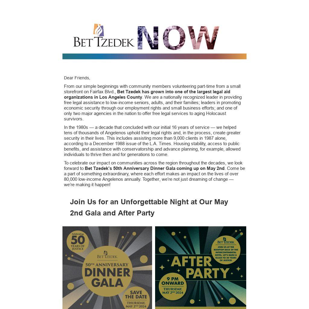 To celebrate our impact on communities across the region throughout the decades, we look forward to Bet Tzedek’s 50th Anniversary Dinner Gala coming up on May 2nd. Come be a part of something extraordinary, where each effort makes an impact on the lives of over 80,000 low-income Angelenos annually. Together, we’re not just dreaming of change — we’re making it happen!