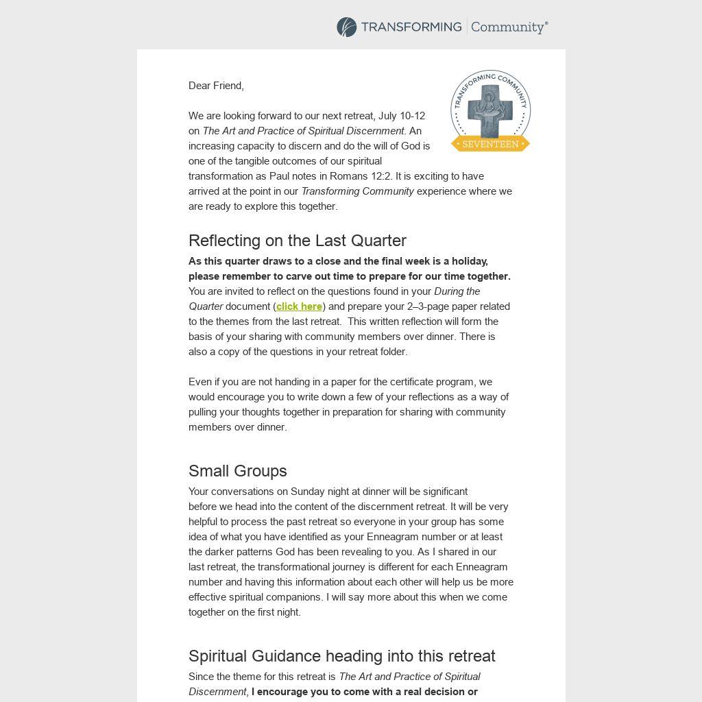 We are looking forward to our next retreat, July 10-12 on The Art and Practice of Spiritual Discernment. An increasing capacity to discern and do the will of God is one of the tangible outcomes of our spiritual transformation as Paul notes in Romans 12:2. It is exciting to have arrived at the point in our Transforming Community experience where we are ready to explore this together.