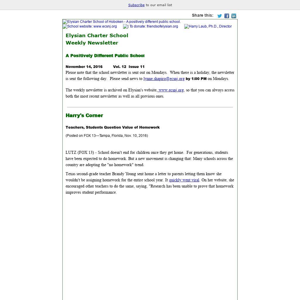 The weekly newsletter is archived on Elysian's website, www.ecsnj.org, so that you can always access both the most recent newsletter as well as all previous ones.