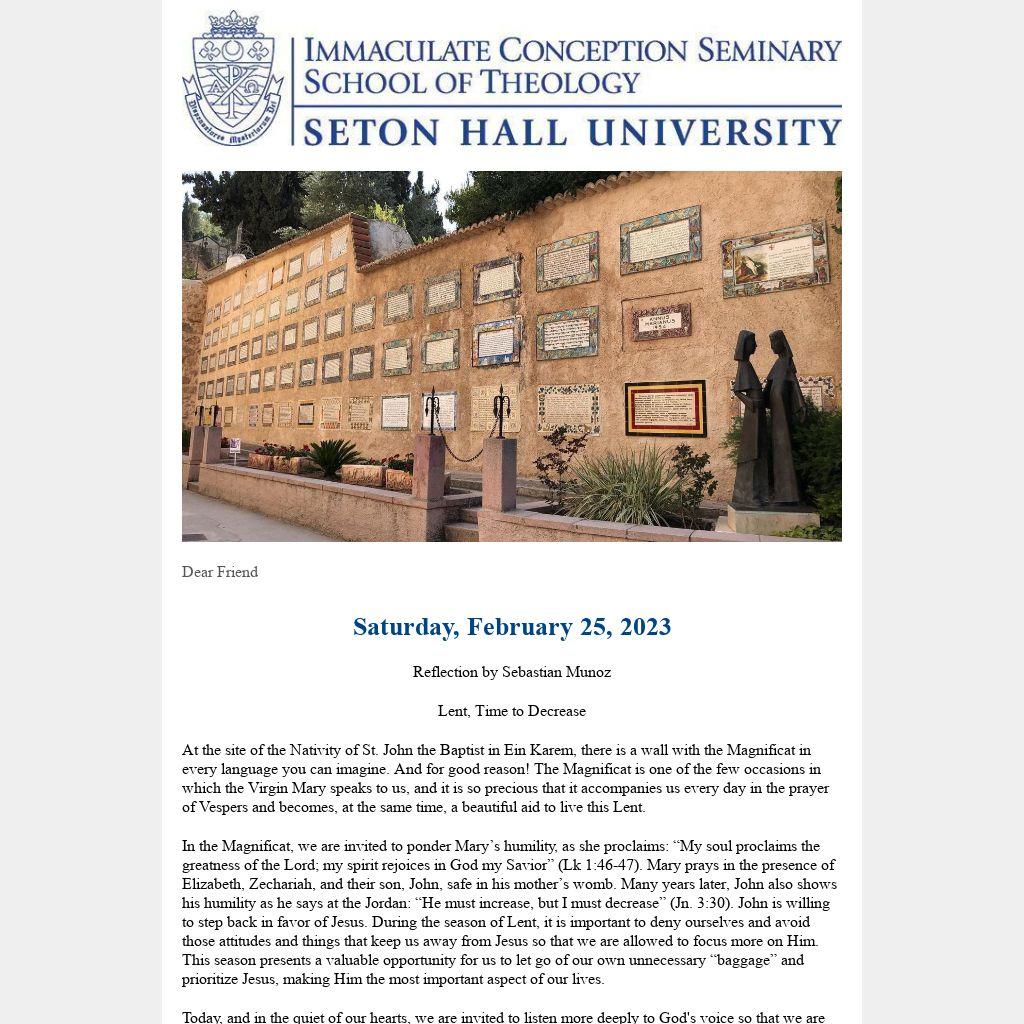 In the Magnificat, we are invited to ponder Mary’s humility, as she proclaims: “My soul proclaims the greatness of the Lord; my spirit rejoices in God my Savior” (Lk 1:46-47). Mary prays in the presence of Elizabeth, Zechariah, and their son, John, safe in his mother’s womb. Many years later, John also shows his humility as he says at the Jordan: “He must increase, but I must decrease” (Jn. 3:30). John is willing to step back in favor of Jesus. During the season of Lent, it is important to deny ourselves and avoid those attitudes and things that keep us away from Jesus so that we are allowed to focus more on Him. This season presents a valuable opportunity for us to let go of our own unnecessary “baggage” and prioritize Jesus, making Him the most important aspect of our lives.