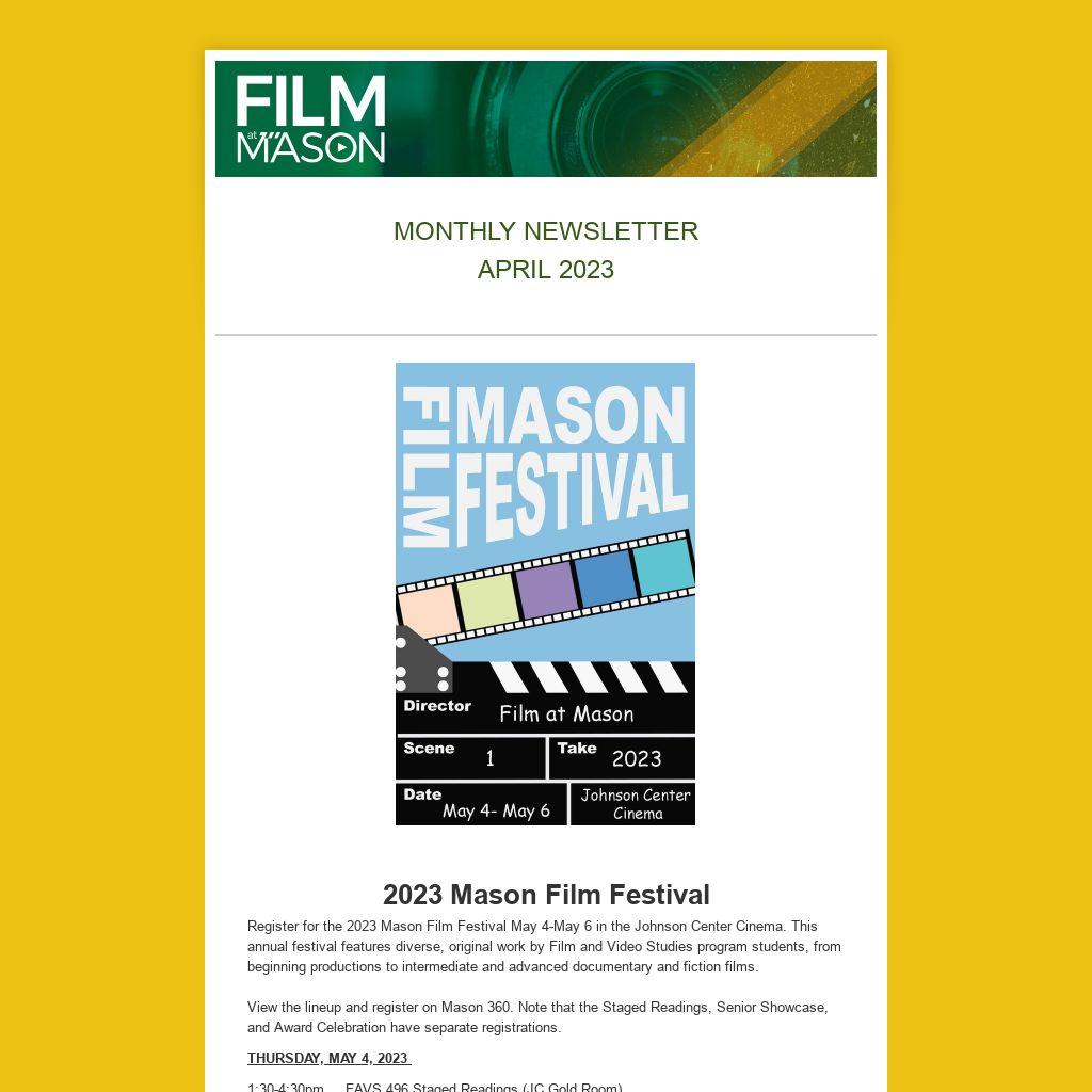 Register for the 2023 Mason Film Festival May 4-May 6 in the Johnson Center Cinema. This annual festival features diverse, original work by Film and Video Studies program students, from beginning productions to intermediate and advanced documentary and fiction films.