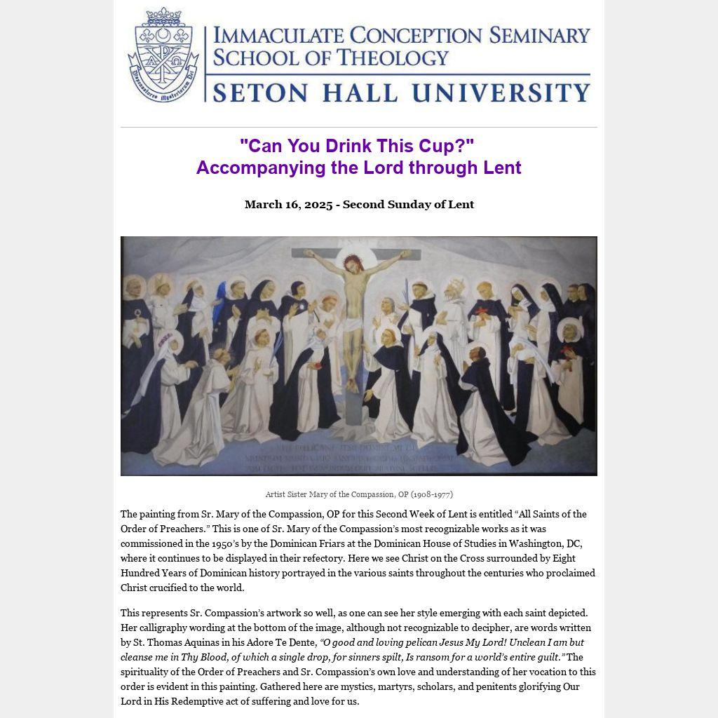 The painting from Sr. Mary of the Compassion, OP for this Second Week of Lent is entitled “All Saints of the Order of Preachers.” This is one of Sr. Mary of the Compassion’s most recognizable works as it was commissioned in the 1950’s by the Dominican Friars at the Dominican House of Studies in Washington, DC, where it continues to be displayed in their refectory. Here we see Christ on the Cross surrounded by Eight Hundred Years of Dominican history portrayed in the various saints throughout the centuries who proclaimed Christ crucified to the world.