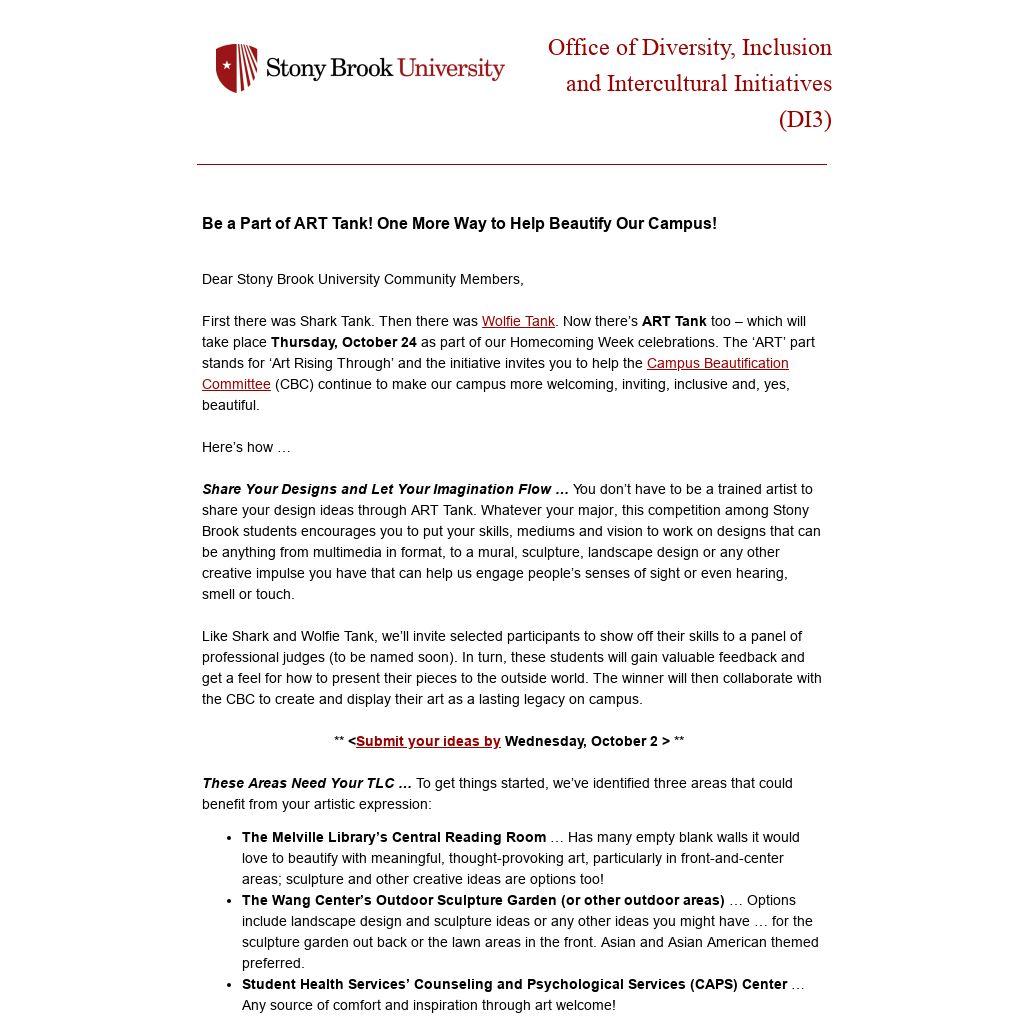 Share Your Designs and Let Your Imagination Flow … You don’t have to be a trained artist to share your design ideas through ART Tank. Whatever your major, this competition among Stony Brook students encourages you to put your skills, mediums and vision to work on designs that can be anything from multimedia in format, to a mural, sculpture, landscape design or any other creative impulse you have that can help us engage people’s senses of sight or even hearing, smell or touch.