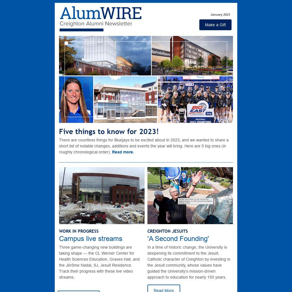 In this especially anticipatory issue of Alumwire, let’s not forget to reflect, as well! Here are 25 great things that happened at Creighton in 2022. See the list.