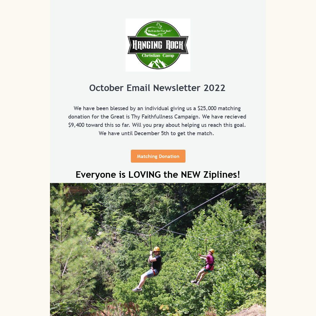 Fall has arrived and there is a brisk chill in the air. It is refreshing every year to experience the change of seasons. I have told people in the past that it would be nice to live somewhere where it is mid 70s year-round, but if I really think about it, I like the change of seasons. Camp life has seasons as well. We are always gearing up for summer camp, but there is retreat season as well. I had a guy at church last week ask me if I am enjoying the slow time at camp and I chuckled. I told him that there isn’t a slow time at camp anymore. We transition from summer camp right in to retreat season. We have had close to 1,500 people on camp property since summer camp ended in August. We are slated to have about 800 people between now and the end of the year with various retreats and groups here. We stay busy around here, while always preparing for next summer. With all of that said we can not do any of this without your support. So, thank you so much for all you do to support the ministry of Hanging Rock.