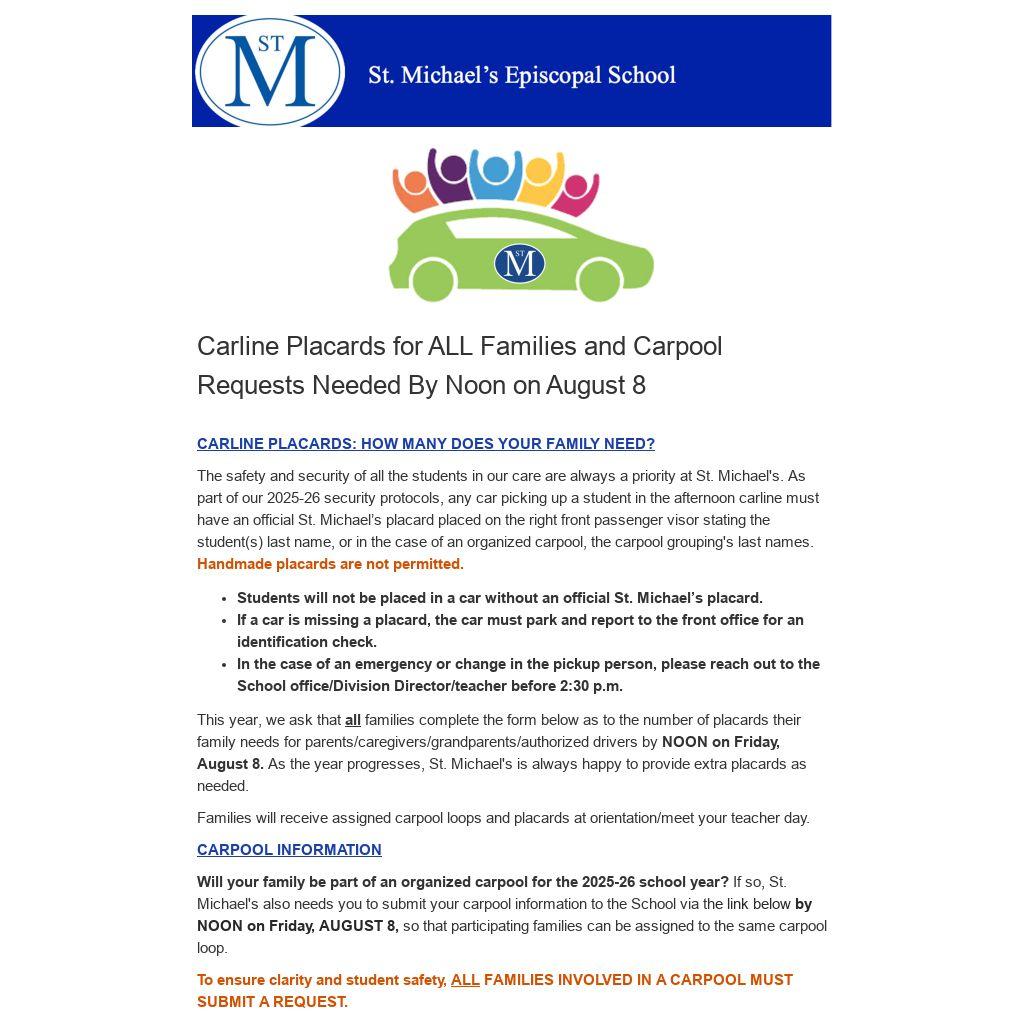 Will your family be part of an organized carpool for the 2025-26 school year? If so, St. Michael's also needs you to submit your carpool information to the School via the link below by NOON on Friday, AUGUST 8, so that participating families can be assigned to the same carpool loop.